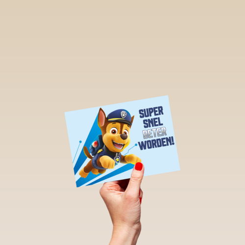 Blauwe beterschapskaart met Chase, voor een zieke Paw Patrol fan. Supersnel beter worden!
