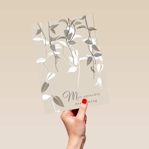 Een condoleance kaart met warme grijstinten en een illustratie van een plant. Met oprechte deelneming.