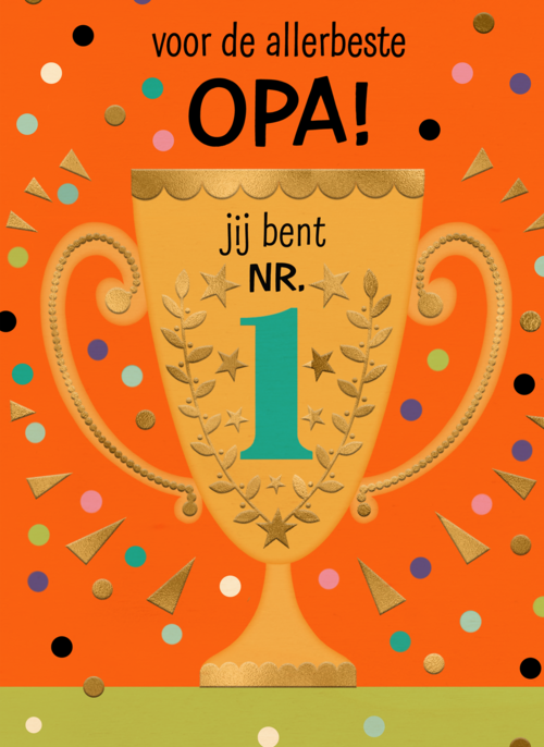 Voor de allerbeste opa, jij bent nr 1! Dat staat opdeze oranje kaart met een grote gele kampioensbeker. Getekend door Ylva Svensson.