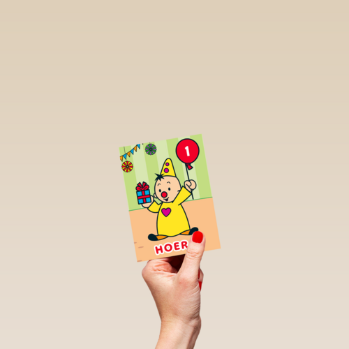 Bumba heeft een cadeautje! En een ballon met daarop de leeftijd van de jarige. De leeftijd pas je zelf eenvoudig aan naar wens. Naar wie stuur je deze vrolijke verjaardagskaart van Bumba?
