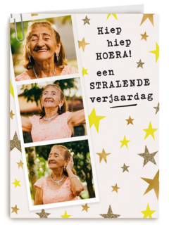 Een stralende verjaardagskaart voor een stralende jarige. De foto's op deze kaart pas je eenvoudig aan naar wens.