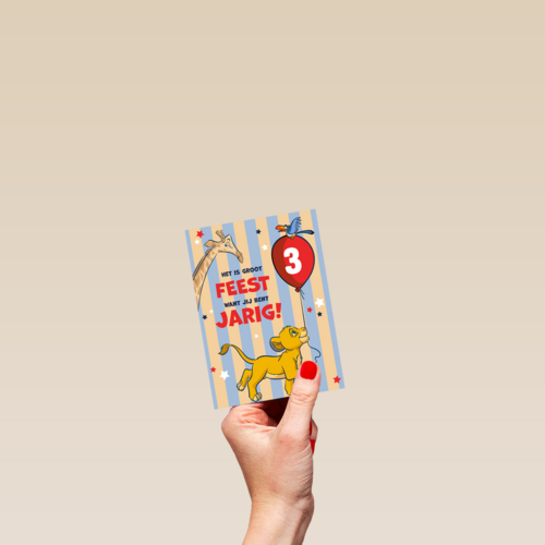 Het is groot feest want jij bent jarig. Simba loopt vrolijk met een ballon in zijn mond rond, want hij is blij dat jij jarig bent. Stuur deze vrolijke Lion King naar iemand die jarig is. Het getal op de ballon pas je eenvoudig aan naar wens.