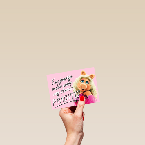 Miss Piggy kaart met een roze achtergrond. "Een jaartje ouder maar nog steeds prachtig!"