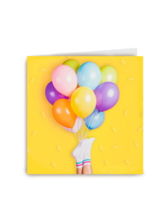 Verjaardagskaart tros ballonnen, vastgehouden door 2 benen met tennissokken.