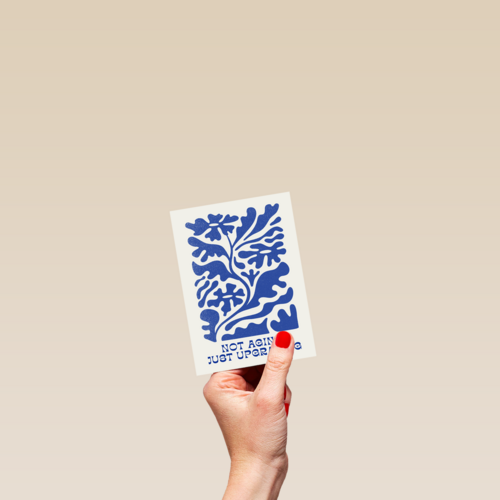Verjaardagskaart met een gestyleerde bloem en de tekst "Not aging, just upgrading."