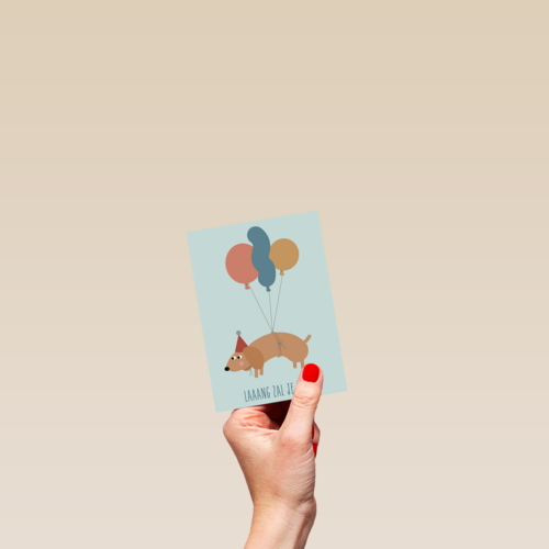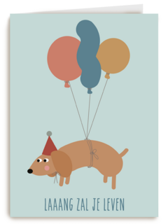 Een verjaardagskaart van een teckel met een feesthoedje, hangend onder een tros ballonnen. Laaang zal je leven!