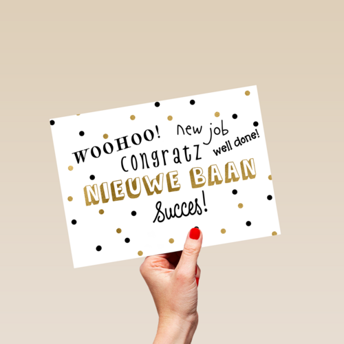 Een witte kaart met in verschillende fonts de teksten: Woohoo! Congratz. New job. Nieuwe baan. Succes! Well done!