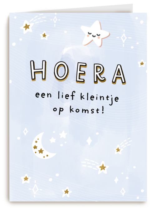 Blauwe kaart met maan en sterren. Hiera een lief kleintje op komst!